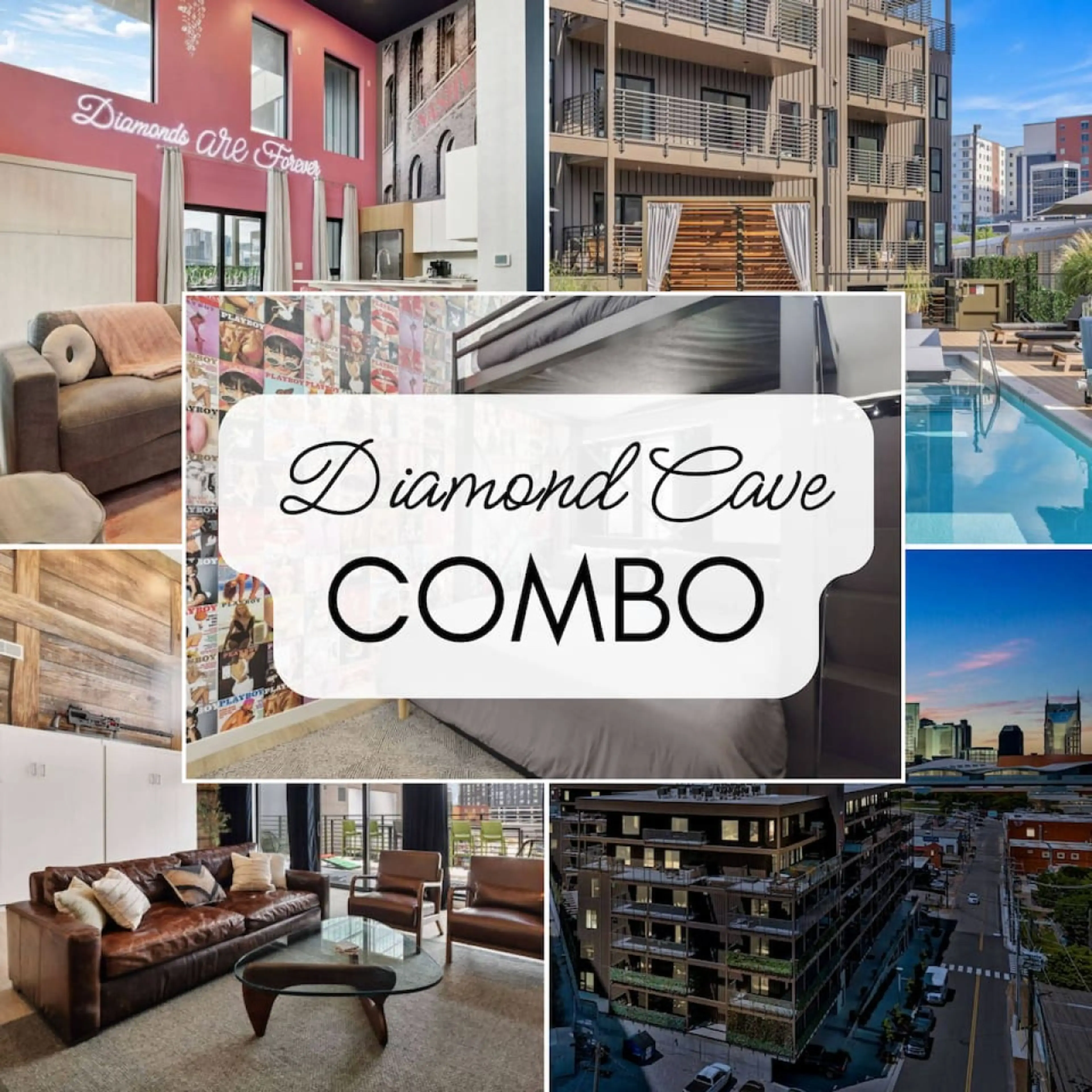 The Diamond Cave (Diamonds Are Forever/The Man Cave Combo) is the ultimate bachelor/bachelorette getaway in Downtown Nashville, featuring two adjacent condos in the Hyve Building that sleep up to 16 guests. Diamonds Are Forever offers a chic, glamorous setting with a private patio, while The Man Cav...